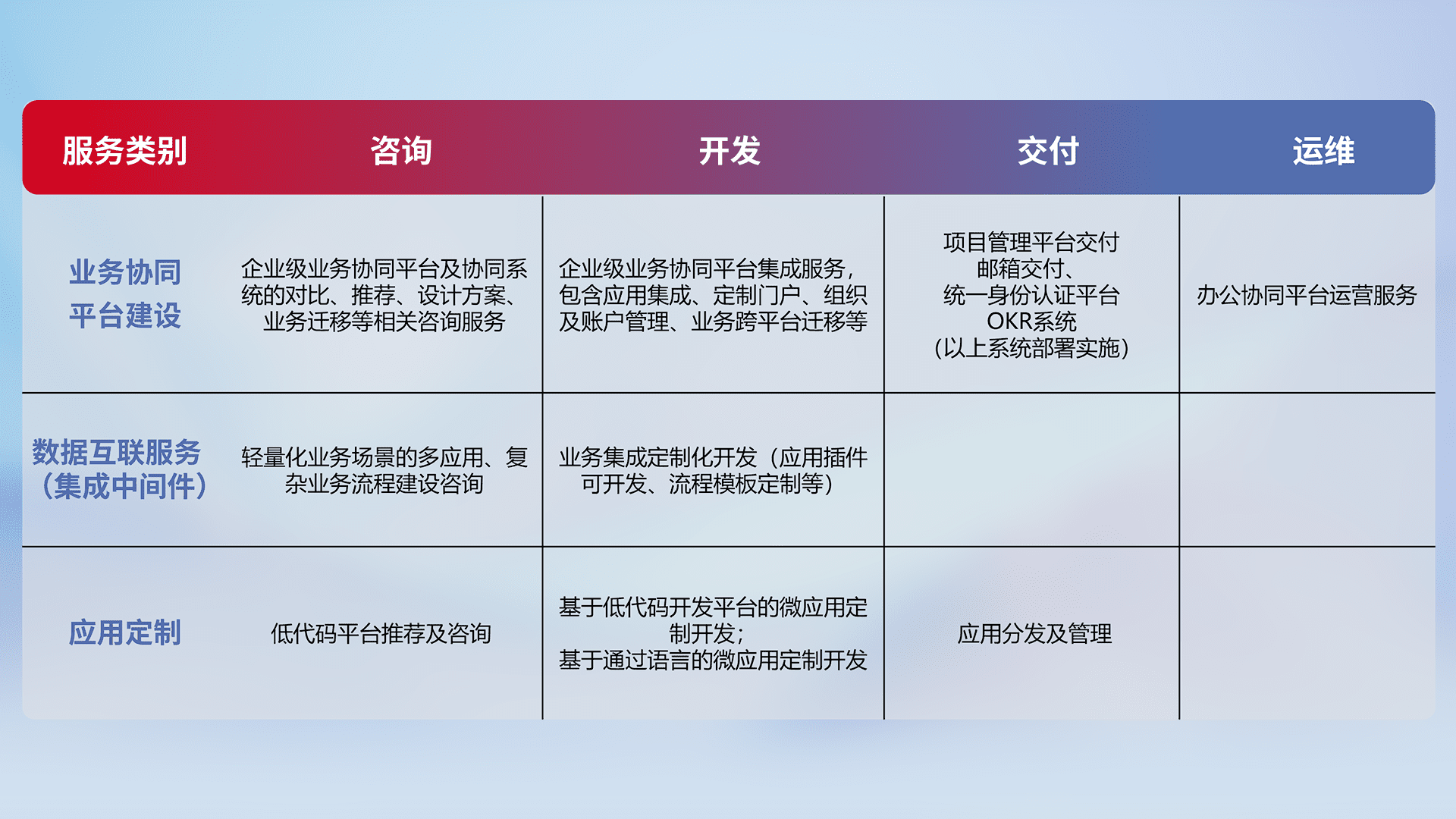 针对钉钉、、企微、、、、IDaas等平台级产品提供产品的规划、、、、方案、、交付、、定制化开发等服务,,,实现如统一协同办公、、、、智能客户服务、、混合会议管理、、智能数据查询、、、、等业务场景,,实现数字化转型。。。