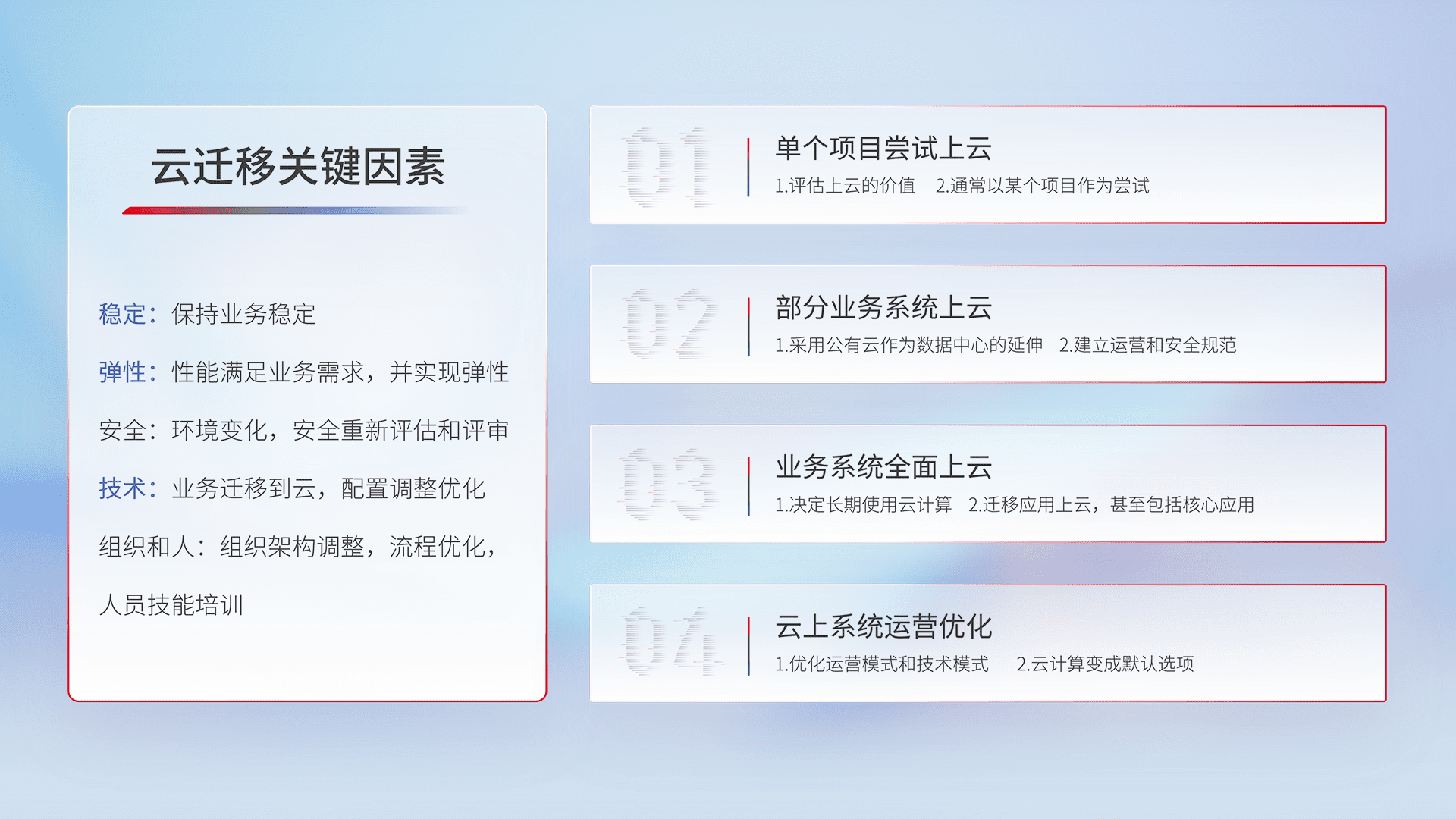 结合实际业务,,从规划设计、、云平台选型、、云原生改造、、数据迁移、、集成交付,,,,迁移全过程为客户识别最佳上云路径,,,做好风险识别管理,,,设计网络架构、、身份权限、、、、安全审计合规、、、、操作审计、、、、日志审计、、、监控告警策略、、多站点容灾设计等,,,,对云上基础设施进行整体规划,,,,提升IT治理水平,,,以满足弹性、、高可用、、、、高性能的需求。。